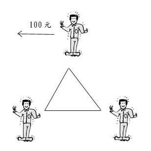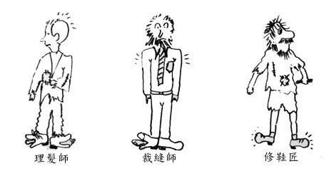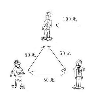 三個窮漢──理髮師、裁縫師及修鞋匠,因為沒錢,所以均不消費,狀況如下: 現在理髮師有位朋友看理髮師很窮,給了他100元,於是── 理髮師→用50元修鞋,50元補衣。 裁縫師→用賺到理髮師的50元修鞋。 修鞋匠→用賺到理髮師的50元和裁縫師的50元去理髮和補衣服。